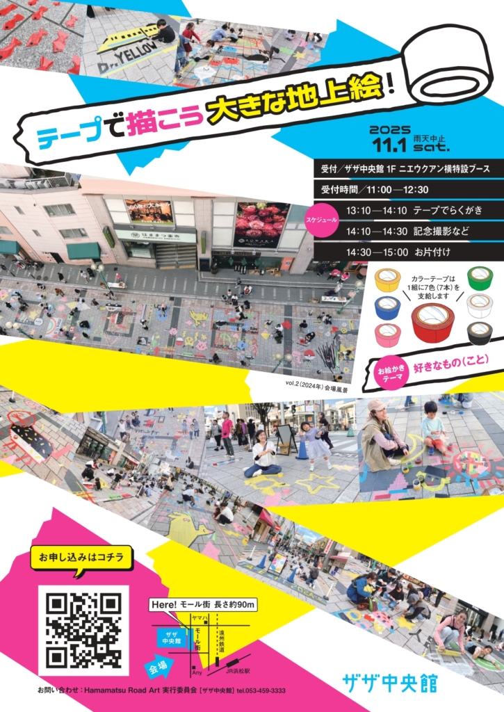 11.1Sat 道路にテープでらくがきしよう!Vol.3 道路にテープでらくがきしよう!Vol.3 ザザ中央館横のモール街側道路にて、テープでらくがきイベントが開催されます。 日時|2025.11.1(土)13:00~ 参加料|1組1,000円 先着順〈30組〉※チラシQRコードから申し込み 受付11:00~12:30(ザザ中央館1Fニエウクアン横特設ブース) 会場|モール街側道路 問合せ|Hamamatsu Road Art 実行委員会[ザザ中央館]
