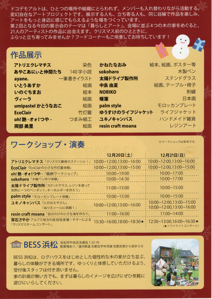 🎨内容:アーティスト21名による合同展示(入場無料)、ワークショップ・作品販売あり(有料)