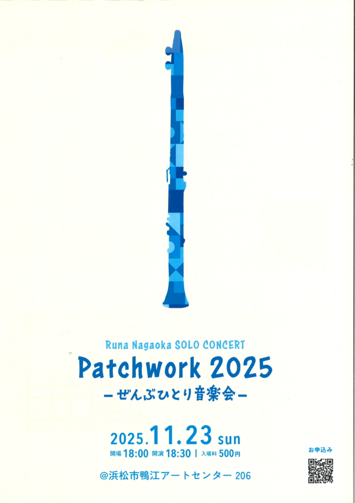 11.23Sun ぜんぶひとり音楽会 Runa Nagaoka SOLO CONCERT Patchwork2025 – ぜんぶひとり音楽会 – 日時:2025年11月23日(日) 18:00開場、18:30開演 会場:浜松市鴨江アートセンター206 入場料:500円(当日受付にてお支払い) ご予約はこちら 【お問い合わせ】 長岡瑠奈 clclrururu.moon@gmail.com